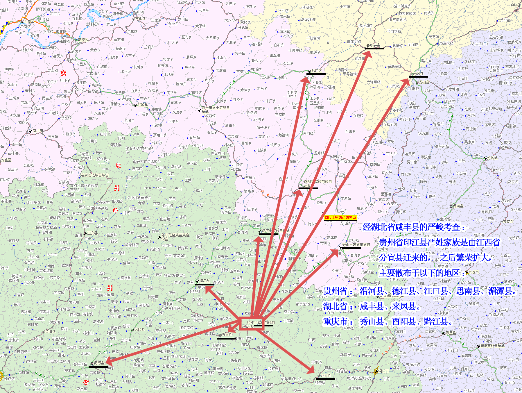 由湖北咸丰的严峻提供的资料制作的图片,显示由江西省分宜县迁到贵州省印江县的严姓家族的发展情况,下面是贵州省、湖北省、重庆市地区严姓家族的分布图(图片很大,要单击弹新窗后再放到1:1再看),如果谁有更详细的资料请跟进提供。