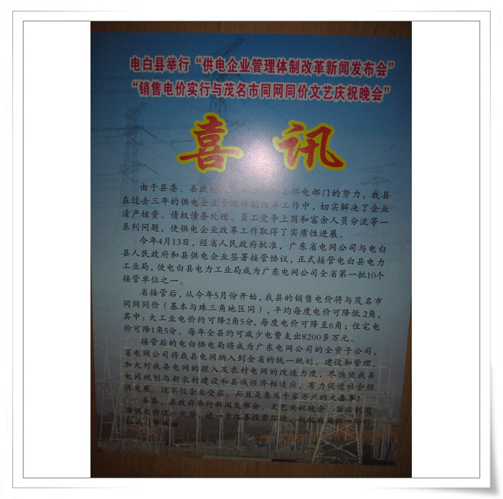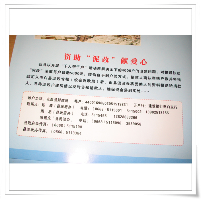 QUOTE(四中乐叔 @ 2007年06月03日 Sunday, 12:40 AM) 6月2日下午,电白县人民政府广州天河大厦召开恳亲会。 [snapback]1772776[/snapback] 今年的亮点是倡议乡贤支持和捐助农村泥砖房的改建。 政府或乡贤每捐款5000元,就能支持一户改建泥砖房。 杨秋董事长在会上宣布捐赠100户泥砖房改造。捐款金额50万。 还有几个老板答应捐款给20户泥砖房改造。