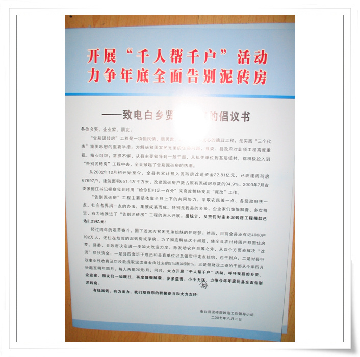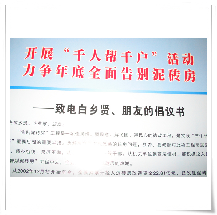 QUOTE(四中乐叔 @ 2007年06月03日 Sunday, 12:48 AM) 今年的亮点是倡议乡贤支持和捐助农村泥砖房的改建。 政府或乡贤每捐款5000元,就能支持一户改建泥砖房。 杨秋董事长在会上宣布捐赠100户泥砖房改造。捐款金额50万。 还有几个老板答应捐款给20户泥砖房改造。 [snapback]1772785[/snapback]