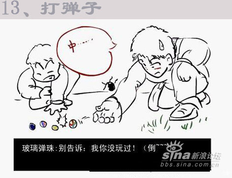 此帖让我拾回了童年的乐趣,前段时间正想收集童年时有趣的玩意乐事,准备写一篇文章以作怀念.每个时代孩童都有他们的玩意玩具符号,从小石子到玻璃珠到连环画到变形金刚......淘汰一批又新生一批,当童年与我们渐行渐远,童年的记忆也越来越依稀,这些记忆碎片也越来越弥足珍贵.