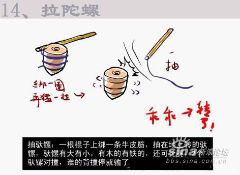7、推铁环和陀螺。推铁环已经忘记是什么铁环了,(大家记得的话请告知我也好)不过我还记得推铁环的柄好象是铁丝弯成S壮,套在环里推的。那时陀螺不象现在市面上五花八门的,那时候陀螺世面是没有卖的,都是我们自己动手做的。是用烧柴的木砍成圆锥形在底部放粒钢珠就完成了