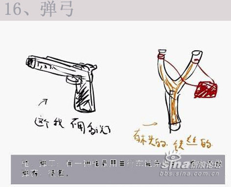 7、弹弓,也是自己造的,主要材料是街道两旁的Y字行的树丫,在两头绑着橡皮筋,然后在橡皮筋中间绑一小块废旧的车胎用来包住“子弹”的。