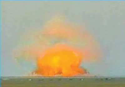 画面显示,一架图―160型战略轰炸机把炸弹投放到试验场地后,炸弹爆炸,形成一团类似核弹燃烧的“蘑菇云”。爆炸后,断瓦残垣旁只剩烧焦的土壤和巨石,爆炸目标可能是一幢多层建筑。