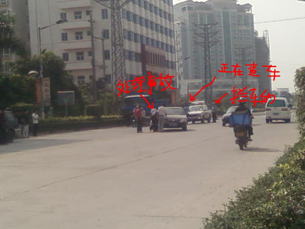QUOTE(王老四 @ 2007年10月18日 Thursday, 10:43 AM) 这个图并没有反映交警一边处理事故一边查车。一般来说,在处理事故时无时间查车的,可能楼主见交警在站着,害怕了便绕道走。 [snapback]1973831[/snapback] 相机不好。 我经过时候已查扣两辆摩托车。 本人经过的时候交警已打算截停。幸好本人掉头走了。