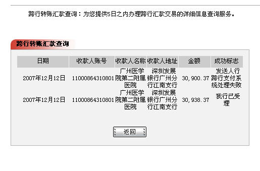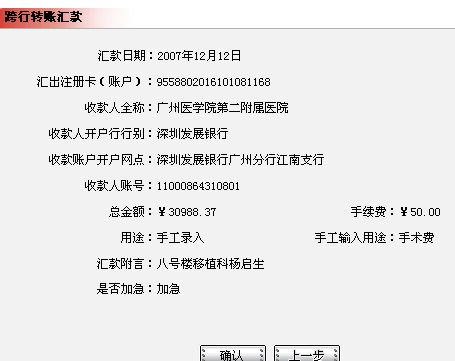 QUOTE(半个人 @ 2007年12月12日 Wednesday, 05:10 PM) 募捐账户余额(未含徐长卿收的现金捐款)30938.37已通过网上银行转帐到广州医学院第二附属医院账户,大约24小时到达医院账户。 [snapback]2032188[/snapback]