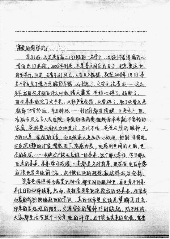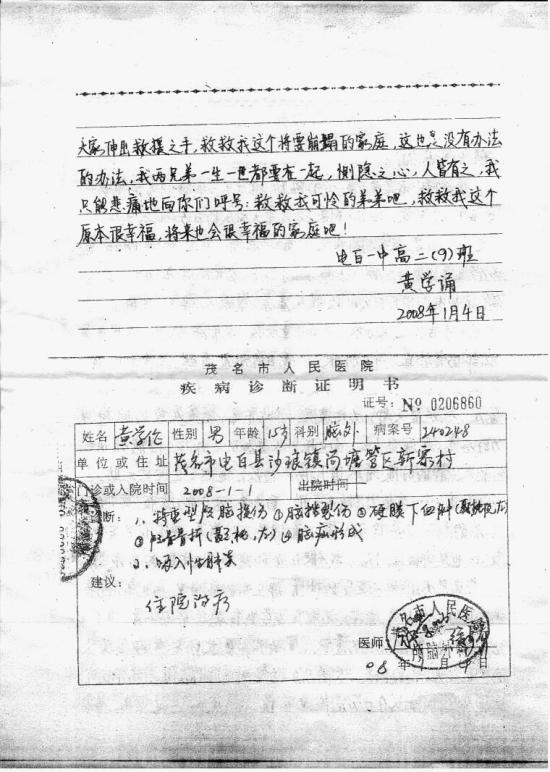 来自电白县沙琅镇尚塘管区新寨村的一户小家庭的求救, 2008.1.1,就读电白中学初三(7)班的黄学伦同学,在回家的路上,遇到车祸