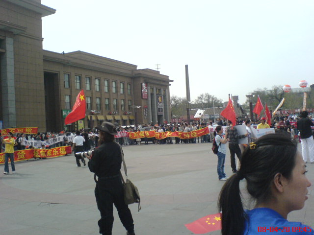 说到穿反ZANGDU衣服的问题,他说不能穿,我说,那我就随便平时穿着在学校里溜达都不可以?他说,那你们学校的老师会找你的……另一个女生说,我们穿什么衣服都要管呀,他说,你穿这个衣服没有问题啊,关键是你会造成一定的影响啊,你会影响到你周围的人啊,这个影响你能负责么?我们说,我们穿的衣服上也没有什么啊,就是支持奥运,反对分裂啊,这个也不可以么?这个有问题么……他们笑了,你们穿这种衣服有目的吧,这个目的就和平时的穿衣服不一样吧,我们何必那么掩耳盗铃呢……我们都笑了,没有再说……