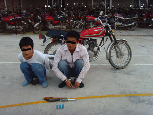 3月20日早上8时许,电城镇村民张某驾驶摩托车到电城圩办事,行至325国道电城汽库路段时,跟随在其后面的两名男青年突然超过张某,并掏出一支自制散弹枪将张逼停。歹徒抢走张某身上1500多元现金和一部手机后,迅速逃离。