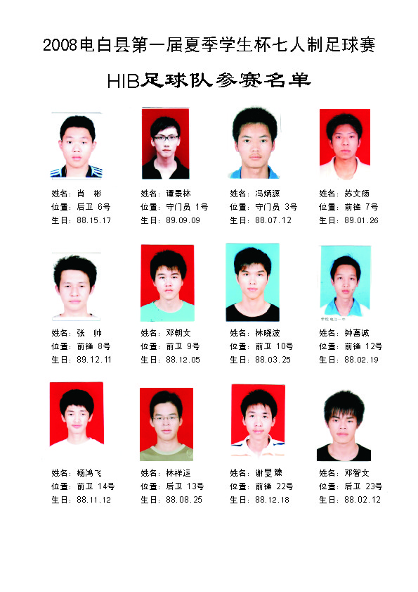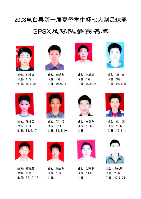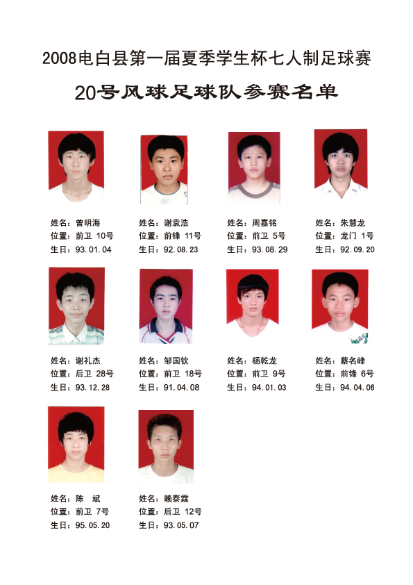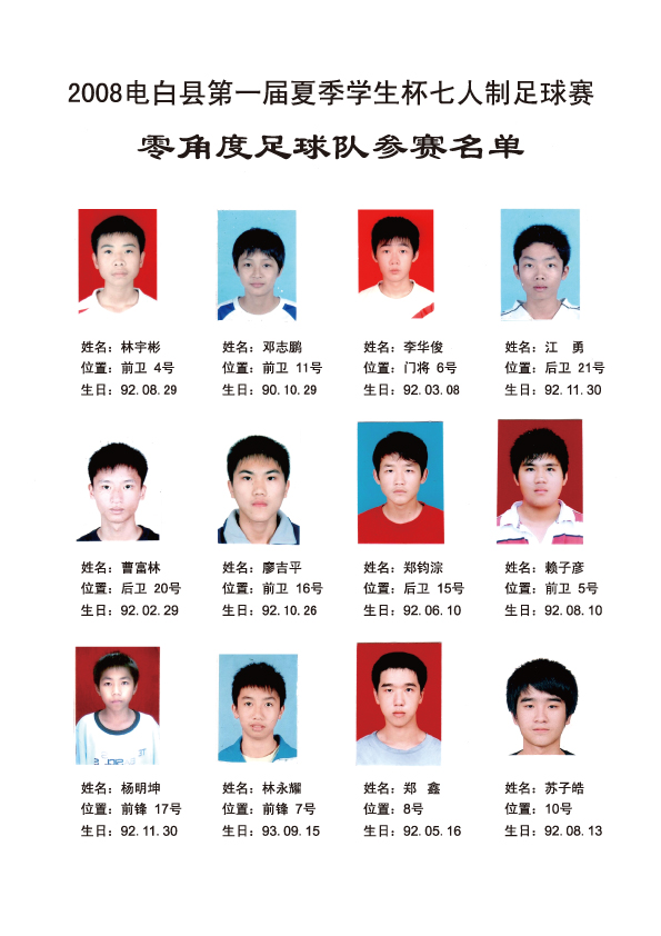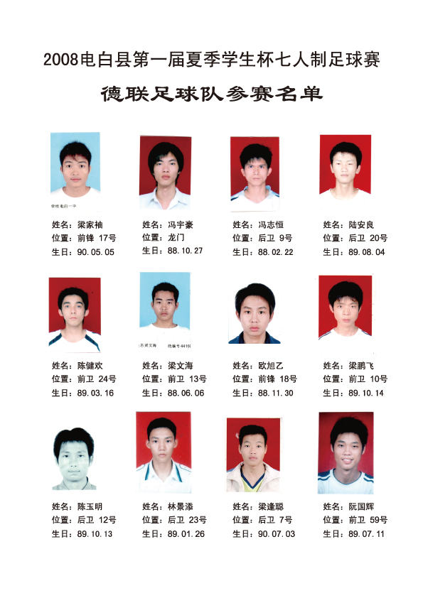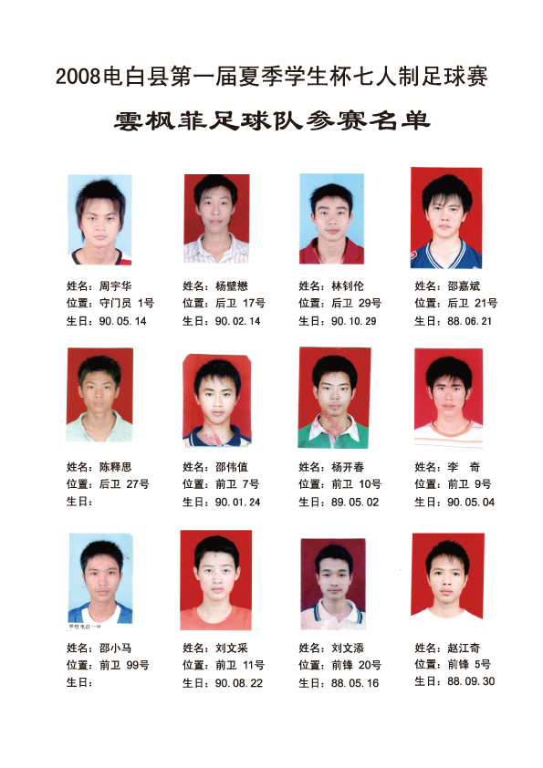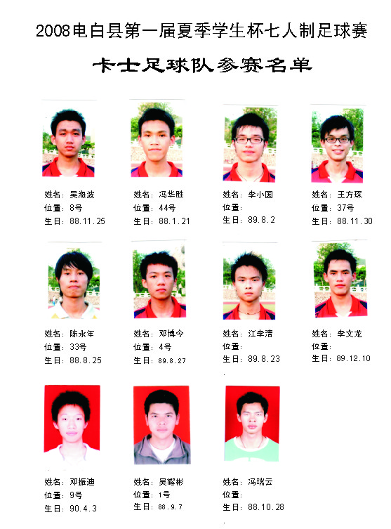 祝2008电白县第一届夏季学生杯足球赛完满成功。。。。! 比赛成绩: 冠军:高州卡士2足球队 亚军:电白云枫菲足球队 季军:电白德联足球队 殿军:茂名GPSX足球队 最隹射手:高州卡士2足球队 12号 李小国