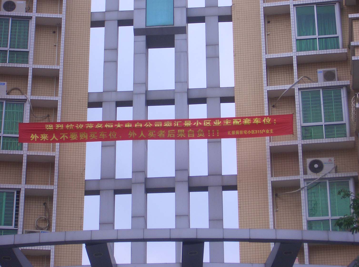 论坛太冷清了,来个水东的新闻 具体情况希望知情人继续补充 [attachmentid=192562] 横幅内容:强烈抗议茂名恒大电白分公司卖汇景小区业主配套车位, 外来人不要购买车位,外人买者后果自负!!!! --汇景菀住宅小区315户业主 [attachmentid=192561]