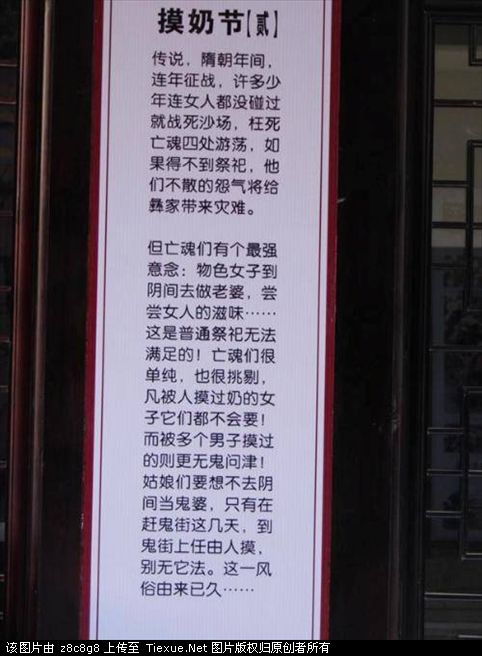[attachmentid=202397][attachmentid=202398]八月十五日,是农历“七月半”,又称“鬼节”。这一天,在云南的少数民族聚居地,还有各种各样的神秘节日。楚雄彝族自治州双柏县窝家彝族乡的“摸奶节”就是其中之一。 风俗习惯是那天当地的女人穿的上衣是只遮住一边乳房的,没遮住的另一边乳房,凡参加节日的人都可以摸,遮住的另一边乳房是为自己将来的老公保留的(参加者一定要记住这个规矩),反正是在一个很小的地方每年都举行的节日,所以大家也不要太奇怪