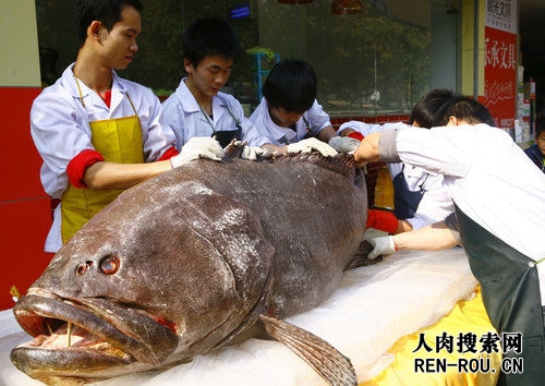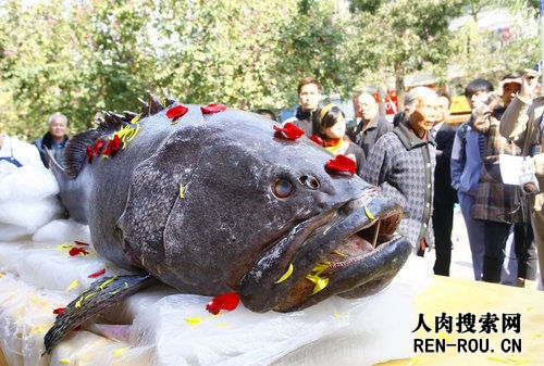 2009年1月14日上午,珠海夏湾中学附近一火锅店门口摆放一条巨大的石斑鱼,吸引过往市民驻足观看。据该店老板介绍,石斑鱼是其从南澳渔民手中花6万元购得的,重达618斤,长2.05米。记者从网上资料获悉,目前,我国最大石斑鱼(已发现)重313公斤,长2.35米。