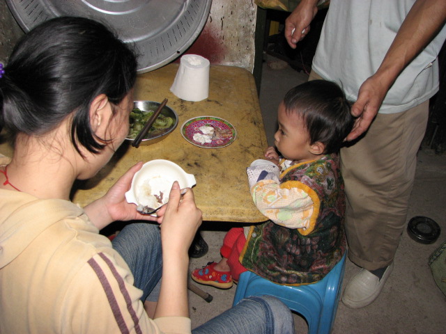 父亲在为小睿坤喂食,母亲在为她擦汗,怕她着冷,这是一幅爱的图章。可怜天下父母心,爱在小屋里升华。