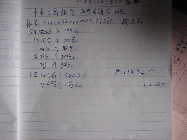 另外,今天有3个同学朋友托我汇款了。分别是80+80+200=360元。这两天我就转到赖先生的工行卡里去。
