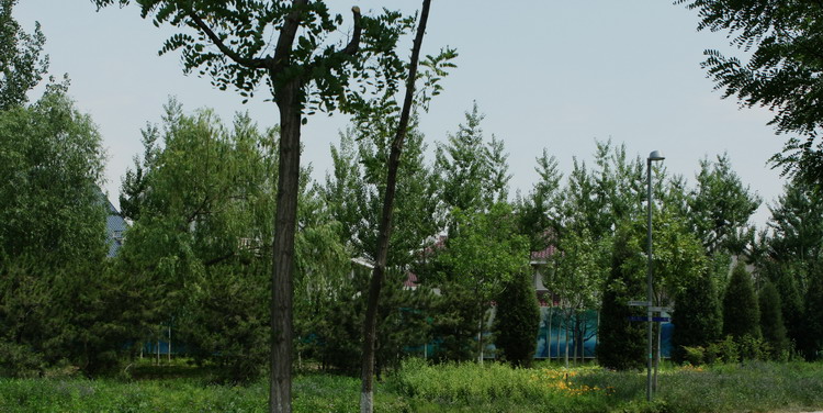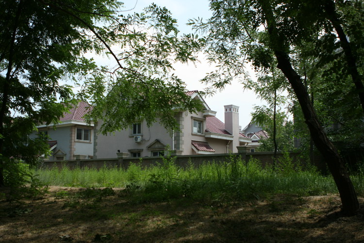 因好奇,端午节小长假的最后一天,上午到奥林匹克森林公园游玩,进南门,延公园东路行至东门附近,见茂密的林中有高档别墅样子的建筑群,不细看,不会引起游客的注意,其用约三米高宣传彩板围档起来,游人走近可看到别墅二层以上及屋顶,围档有铁制栅栏门与公园相通,无人看守,时有民工进出,从栅栏门往里张望,停放很多一般的普通轿车,象似无人打理的院落。延围档外侧行至北面,围墙外是一小片高而密的树林。向东穿过树林,见围墙边的林中有美术爱好者写生,画的是别墅素描。行至东侧,有小土道可进入别墅区院内,见都是两三层的独门独院式别墅,约有三十余栋,大小不一,样式大同小异,门窗都未安装,尚未装修,无人入住,院南有似高档会所的建筑,院内杂草丛生,杂物乱放,拉圾乱丢,时而可见民工进出一些别墅,从窗口可看到有上下床铺,似有民工住。笔者在院内转一圈,进入一栋无人别墅,因内急,上二层,寻一“卫生间”,方便后即离开。