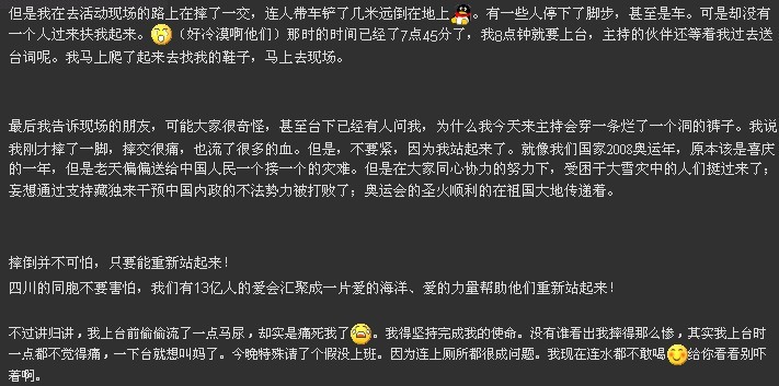 我在这里用QQ截取一些去年为四川同胞赈灾酬款活动后在空间发表的图片,希望可以让大家也感受下做义工的我们拥有的是一颗什么样的心!不知道能不能显示出来。假如显示不了,应该就在附件那里。