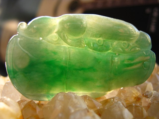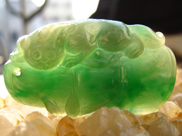 绿颜色是由于含有微量铬、铁元素所致。绿色是翡翠之宝,在决定其经济价值时占有很大的比重。